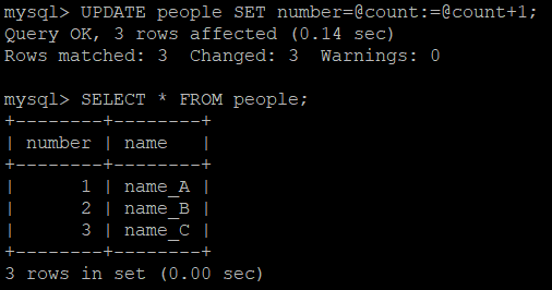UPDATE 테이블 이름 SET 컬럼 이름=@count:=@count+1;
