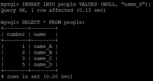 ex) INSERT INTO people VALUES (NULL, "name_D");