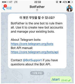 BotFather : bot을 생성, 관리할 수 있는 계정(bot 형태)입니다.