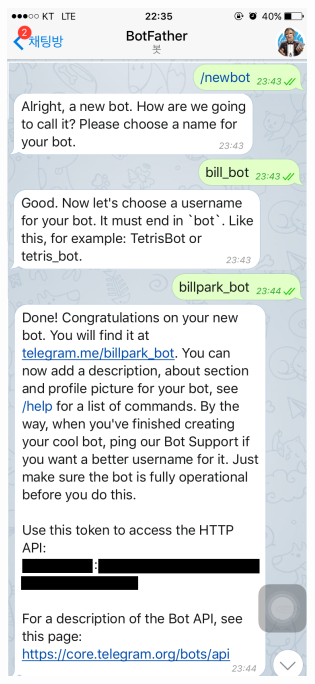 1-6. Access token 메모: 1-4까지 진행하면 BotFather가 메세지를 보내는데 이것이 Access token이다.