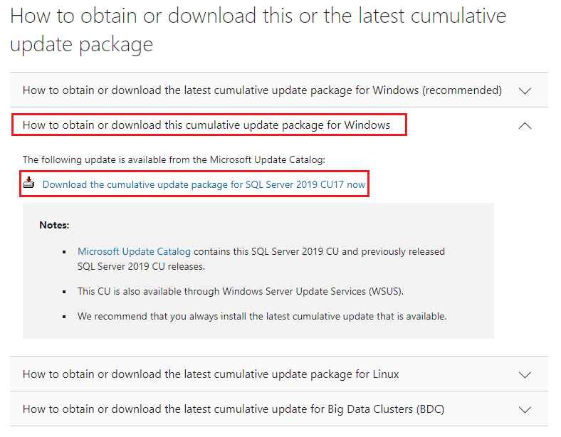 CU 17 다운로드 링크 : https://support.microsoft.com/en-us/topic/kb5016394-cumulative-update-17-for-sql-server-2019-3033f654-b09d-41aa-8e49-e9d0c353c5f7#obtain